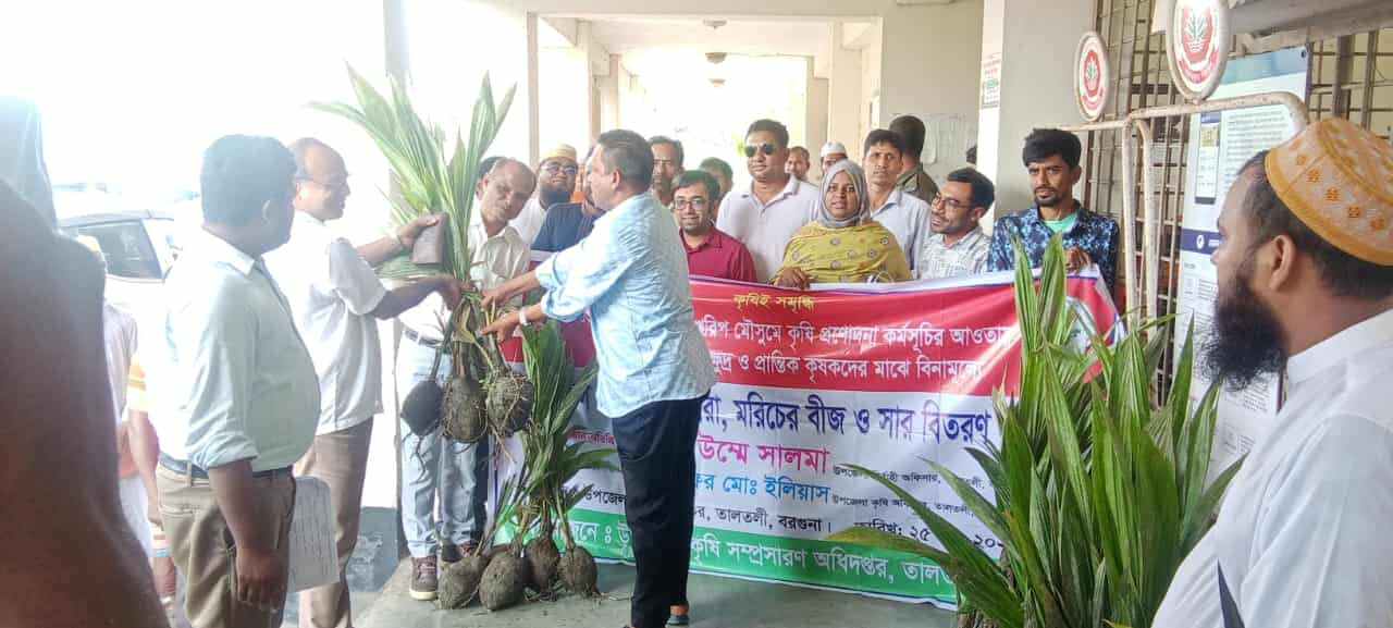 তালতলী উপজেলা কৃষি কর্মকর্তা কৃষিবিদ আবু জাফর মো: ইলিয়াস এর সভাপতিত্বে প্রধান অতিথি হিসেবে বিতরণ কার্যক্রম উদ্বোধন করেন উপজেলা নির্বাহী কর্মকর্তা (ইউএনও) জনাব উম্মে সালমা। উপজেলার ৪৮ টি প্রতিষ্ঠান ও ৪০০ জন কৃষকের হাতে উন্নত জাতের মোট ২৪৮০ টি নারিকেল চারা তুলে দেওয়া হয়। প্রতিজন কৃষক পান ৫টি করে চারা ও প্রতিষ্ঠান ১০ করে চারা পাবে।