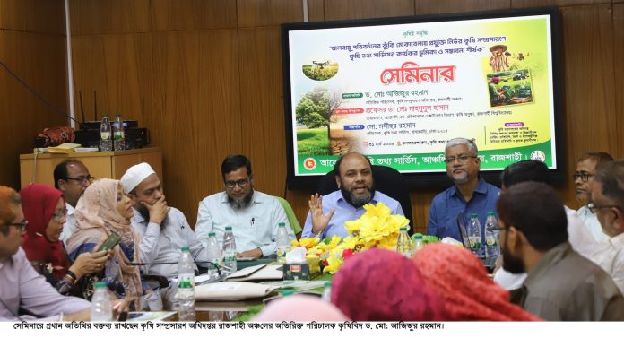 নিজস্ব প্রতিনিধি: কৃষি তথ্য সার্ভিস রাজশাহী অঞ্চলের কনফারেন্স রুমে কৃষি তথ্য সার্ভিস, রাজশাহীর আয়োজনে ‘‘জলবায়ু পরিবর্তনের ঝুঁকি মোকাবেলায় প্রযুক্তি নির্ভর কৃষি সম্প্রসারণে কৃষি তথ্য সার্ভিসের কার্যকর ভূমিকা ও সম্ভাবনা” শিরোনামে মঙ্গলবার (৩১ মার্চ, ২০২৬) এক সেমিনার অনুষ্ঠিত হয়।