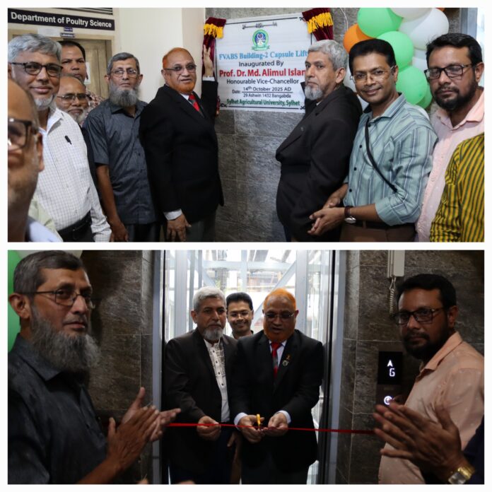সিকৃবি প্রতিনিধি : সিলেট কৃষি বিশ্ববিদ্যালয়ের (সিকৃবি) ভাইস চ্যান্সেলর প্রফেসর ড. মোঃ আলিমুল ইসলাম বলেছেন, শিক্ষা ও গবেষণার পরিবেশ আধুনিক ও মানসম্মত রাখতে অবকাঠামোগত উন্নয়ন অপরিহার্য। ১৪ অক্টোবর (মঙ্গলবার) বিকাল ৩.০০ ঘটিকায় ভেটেরিনারি, এনিম্যাল ও বায়োমেডিক্যাল সায়েন্সেস অনুষদের শিক্ষক-শিক্ষার্থীদের সুবিধার্থে এফভিএবিএস অনুষদের নতুন ভবনে ক্যাপসুল লিফট উদ্বোধন করেন সিকৃবি ভাইস চ্যান্সেলর প্রফেসর ড. মোঃ আলিমুল ইসলাম।