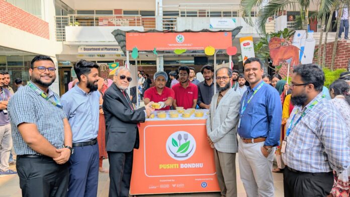 Special Reporter: To celebrate World Food Day 2025, the Department of Nutrition and Food Engineering (NFE) at Daffodil International University with support from the Global Alliance for Improved Nutrition and SUN Youth Network Bangladesh proudly launched a special initiative titled “Pushti Bondhu” aimed at promoting nutrition awareness and healthy eating habits among students at the university on Friday (17 October, 2025).