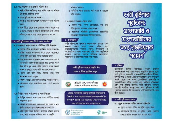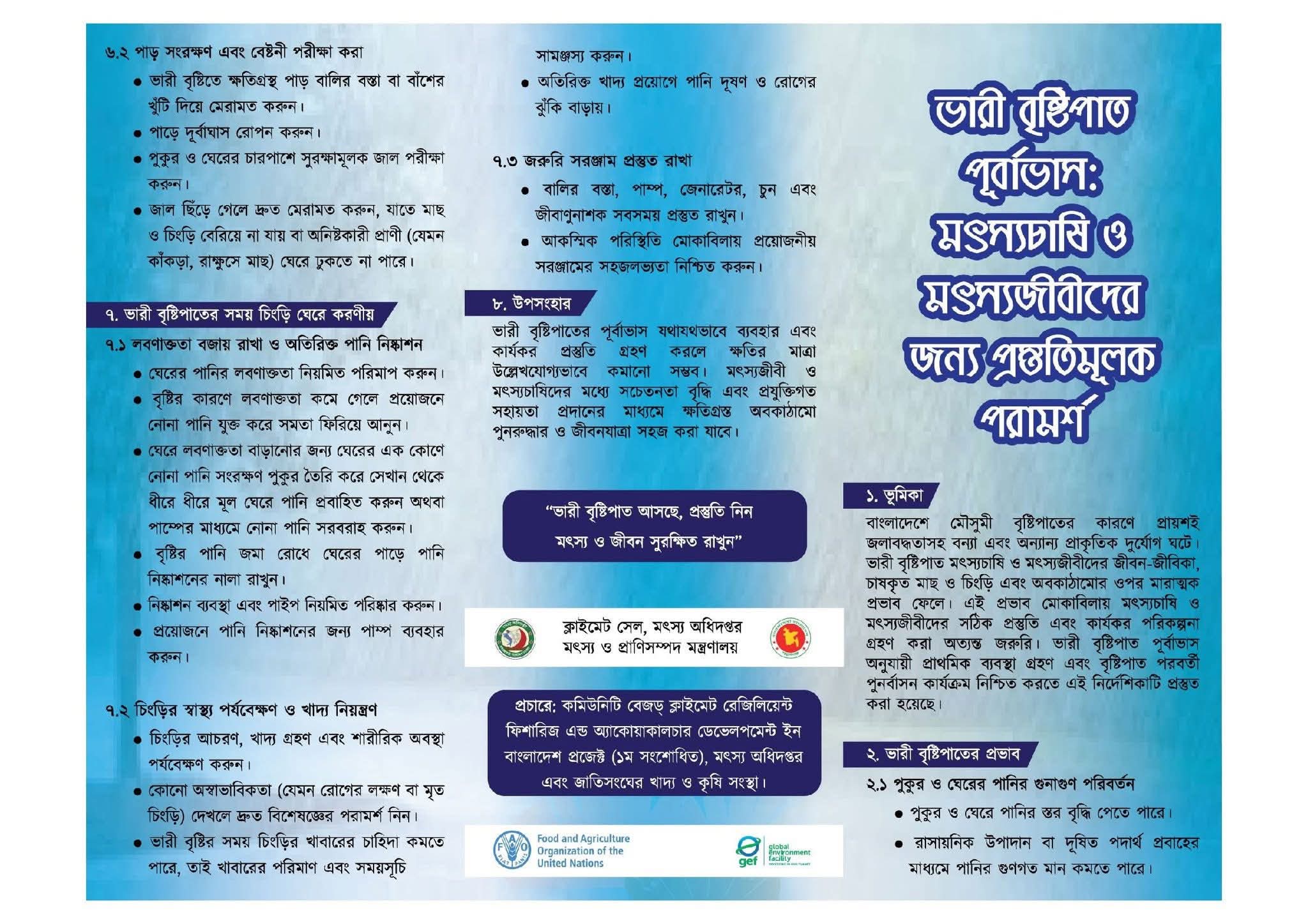 বাংলাদেশে মৌসুমী বৃষ্টিপাতের কারণে প্রায়শই জলাবদ্ধতাসহ বন্যা এবং অন্যান্য প্রাকৃতিক দুর্যোগ ঘটে। ভারী বৃষ্টিপাত মৎস্যচাষি ও মৎস্যজীবীদের জীবন-জীবিকা, চাষকৃত মাছ ও চিংড়ি এবং অবকাঠামোর ওপর মারাত্মক প্রভাব ফেলে। এই প্রভাব মোকাবিলায় মৎস্যচাষি ও মৎস্যজীবীদের সঠিক প্রস্তুতি এবং কার্যকর পরিকল্পনা গ্রহণ করা অত্যন্ত জরুরি। ভারী বৃষ্টিপাত পূর্বাভাস অনুযায়ী প্রাথমিক ব্যবস্থা গ্রহণ এবং বৃষ্টিপাত পরবর্তী পুনর্বাসন কার্যক্রম নিশ্চিত করতে এই নির্দেশিকাটি প্রস্তুত করা হয়েছে।