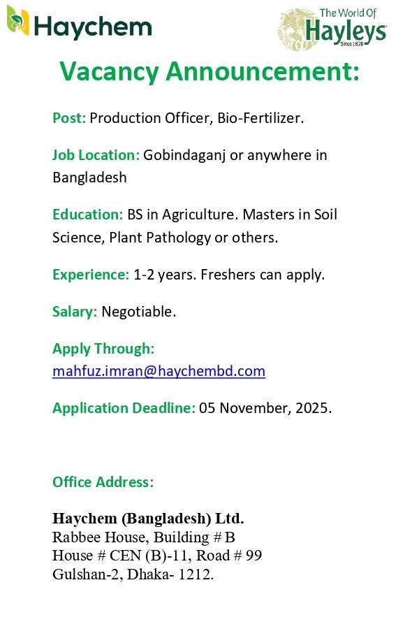HomeJobJobs in Haychem Bangladesh Ltd Job Jobs in Haychem Bangladesh Ltd By October 31, 2025 0 95 Share FacebookTwitterWhatsAppCopy URL Post: Production officer Deadline: 05/11/2025 Share FacebookTwitterWhatsAppCopy URL Previous article𝐈𝐔𝐁𝐀𝐓 𝐁𝐒𝐀𝐠 𝐒𝐭𝐮𝐝𝐞𝐧𝐭𝐬 𝐂𝐨𝐦𝐦𝐞𝐧𝐜𝐞 𝐈𝐧𝐭𝐞𝐫𝐧𝐬𝐡𝐢𝐩 𝐏𝐫𝐨𝐠𝐫𝐚𝐦 𝐚𝐭 𝐊𝐚𝐭𝐡𝐦𝐚𝐧𝐝𝐮 𝐔𝐧𝐢𝐯𝐞𝐫𝐬𝐢𝐭𝐲, 𝐍𝐞𝐩𝐚𝐥Next articleসিকৃবি প্রশাসনের সাথে পিএসসি’র চেয়ারম্যানসহ সদস্যবৃন্দের মতবিনিময় সভা অনুষ্ঠিত https://www.dailyagrinews.com RELATED ARTICLES Job Jobs in Chemist Agrobiotech Ltd November 3, 2025 Job Jobs in Rainbow Agro October 30, 2025 Job 𝙎𝙮𝙣𝙜𝙚𝙣𝙩𝙖 Bangladesh 𝙞𝙨 𝙝𝙞𝙧𝙞𝙣𝙜!!!! October 30, 2025 - Advertisment - Most Popular “Peace and Non-Violence” মূলমন্ত্রে শেকৃবিতে ত্রিদেশীয় ফুটবল চ্যাম্পিয়নশিপে পাঞ্জাব বিশ্ববিদ্যালয় বিজয়ী November 15, 2025 ৩ জানুয়ারি অনুষ্ঠিত হতে যাচ্ছে কৃষি গুচ্ছ ভর্তি পরীক্ষা November 15, 2025 𝐗𝐗𝐈𝐈𝐈 𝐂𝐨𝐧𝐯𝐨𝐜𝐚𝐭𝐢𝐨𝐧 𝐨𝐟 𝐁𝐢𝐝𝐡𝐚𝐧 𝐂𝐡𝐚𝐧𝐝𝐫𝐚 𝐊𝐫𝐢𝐬𝐡𝐢 𝐕𝐢𝐬𝐰𝐚𝐯𝐢𝐝𝐲𝐚𝐥𝐚𝐲𝐚 (𝐁𝐂𝐊𝐕) November 15, 2025 সিলেট জেলার কৃষি উন্নয়নে করণীয় শীর্ষক কর্মশালা অনুষ্ঠিত November 12, 2025 Load more Recent Comments