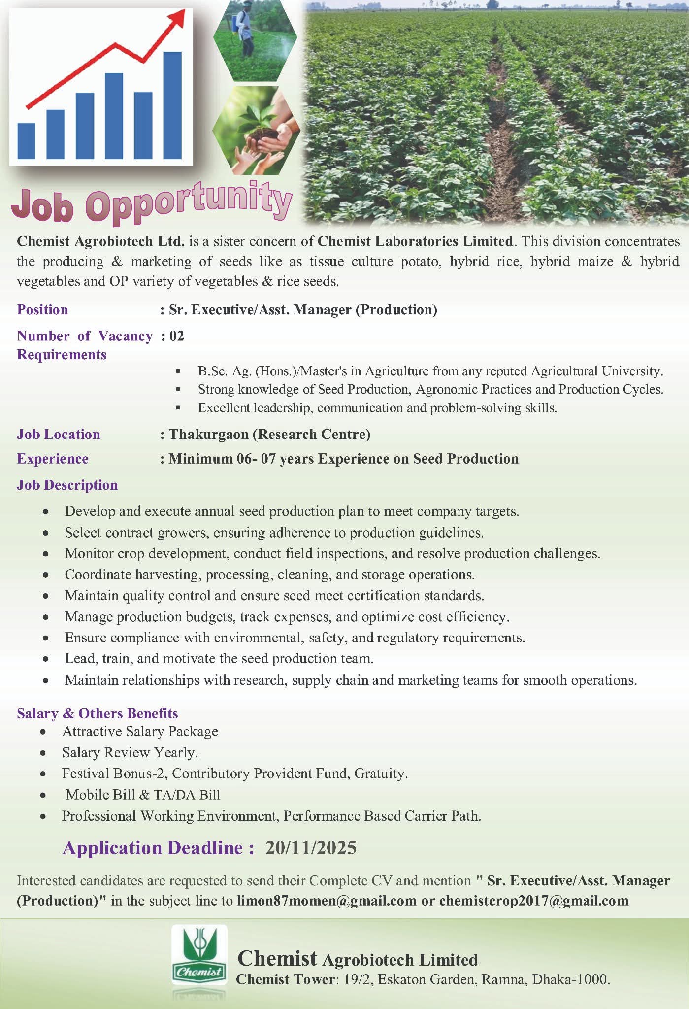 HomeJobJobs in Chemist Agrobiotech Ltd Job Jobs in Chemist Agrobiotech Ltd By November 3, 2025 0 62 Share FacebookTwitterWhatsAppCopy URL Post: Sr Executive / Asst. Manager Deadline: 20/11/2025 Share FacebookTwitterWhatsAppCopy URL Previous articleময়মনসিংহে তারাকান্দা ও ফুলপুর উপজেলায় বিনামূল্যে সরিষার বীজ ও সার বিতরণNext articlePrayash Syngenta Scholarship, Applications Now Open! https://www.dailyagrinews.com RELATED ARTICLES Job Jobs in Haychem Bangladesh Ltd October 31, 2025 Job Jobs in Rainbow Agro October 30, 2025 Job 𝙎𝙮𝙣𝙜𝙚𝙣𝙩𝙖 Bangladesh 𝙞𝙨 𝙝𝙞𝙧𝙞𝙣𝙜!!!! October 30, 2025 - Advertisment - Most Popular “Peace and Non-Violence” মূলমন্ত্রে শেকৃবিতে ত্রিদেশীয় ফুটবল চ্যাম্পিয়নশিপে পাঞ্জাব বিশ্ববিদ্যালয় বিজয়ী November 15, 2025 ৩ জানুয়ারি অনুষ্ঠিত হতে যাচ্ছে কৃষি গুচ্ছ ভর্তি পরীক্ষা November 15, 2025 𝐗𝐗𝐈𝐈𝐈 𝐂𝐨𝐧𝐯𝐨𝐜𝐚𝐭𝐢𝐨𝐧 𝐨𝐟 𝐁𝐢𝐝𝐡𝐚𝐧 𝐂𝐡𝐚𝐧𝐝𝐫𝐚 𝐊𝐫𝐢𝐬𝐡𝐢 𝐕𝐢𝐬𝐰𝐚𝐯𝐢𝐝𝐲𝐚𝐥𝐚𝐲𝐚 (𝐁𝐂𝐊𝐕) November 15, 2025 সিলেট জেলার কৃষি উন্নয়নে করণীয় শীর্ষক কর্মশালা অনুষ্ঠিত November 12, 2025 Load more Recent Comments