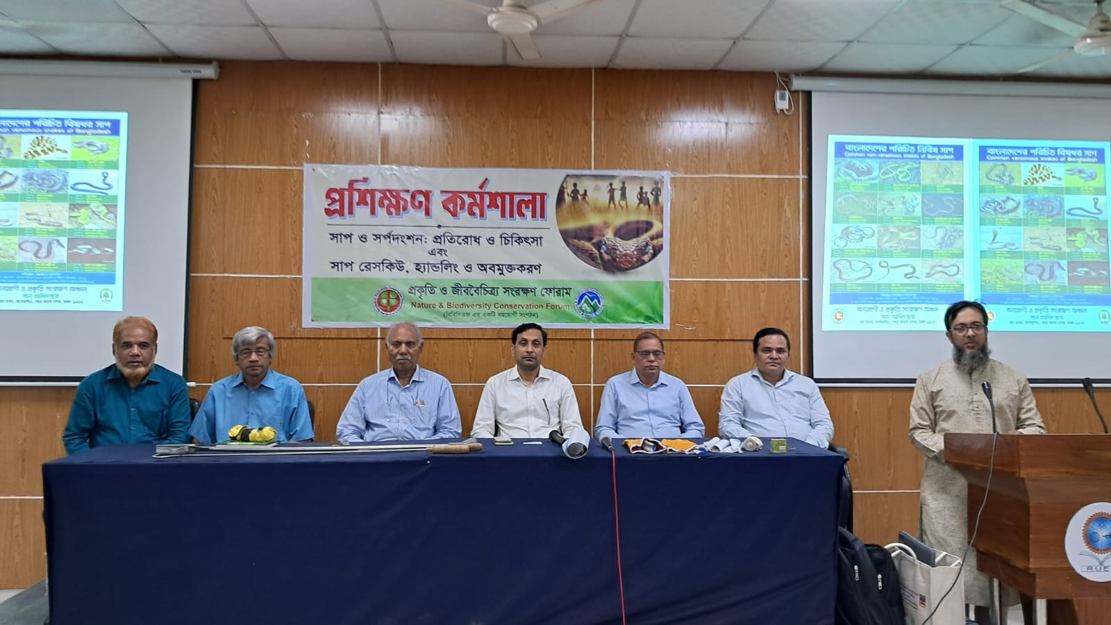 নিজস্ব প্রতিনিধি: প্রকৃতি ও জীববৈচিত্র্য সংরক্ষণ ফোরাম (এনবিসিএফ) এবং বাংলাদেশ জীববৈচিত্র্য সংরক্ষণ ফেডারেশন (বিবিসিএফ) এর যৌথ আয়োজনে রাজশাহীতে অনুষ্ঠিত হয়েছে সর্প দংশন প্রতিরোধ ও চিকিৎসা এবং সাপ উদ্ধার ও অবমুক্তকরণ সংক্রান্ত প্রশিক্ষণ কর্মশালা। শনিবার (২৩ আগষ্ট) দুপুরে ৩ ঘটিকায় রাজশাহী প্রকৌশল ও প্রযুক্তি বিশ্ববিদ্যালয় (রুয়েট) এর প্রশাসনিক ভবনের ২১৭ নং কনফারেন্স রুমে অনুষ্ঠিত হয় উক্ত কর্মশালাটি।